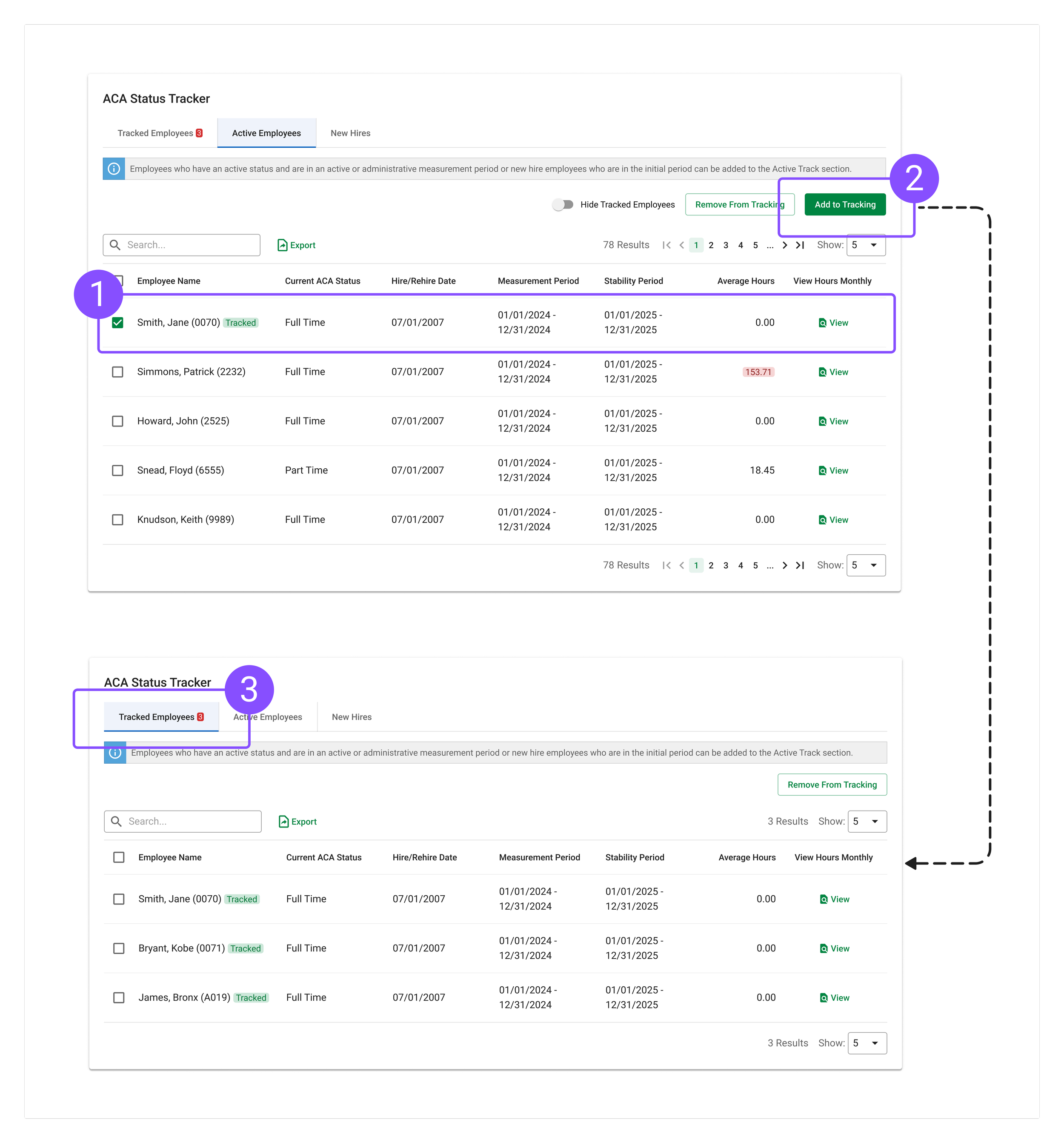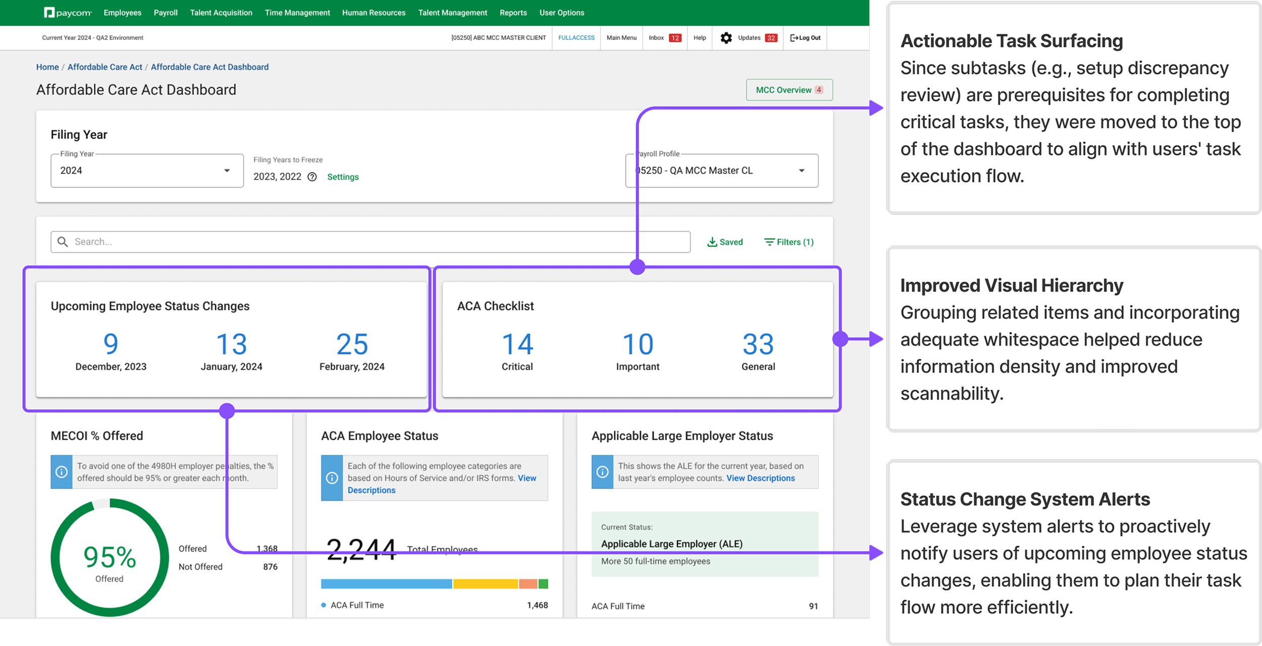 I added an employee tracking feature to help users quickly identify critical employees from a large data pool, streamline status tracking, and prioritize relevant cases for easier ACA monitoring.