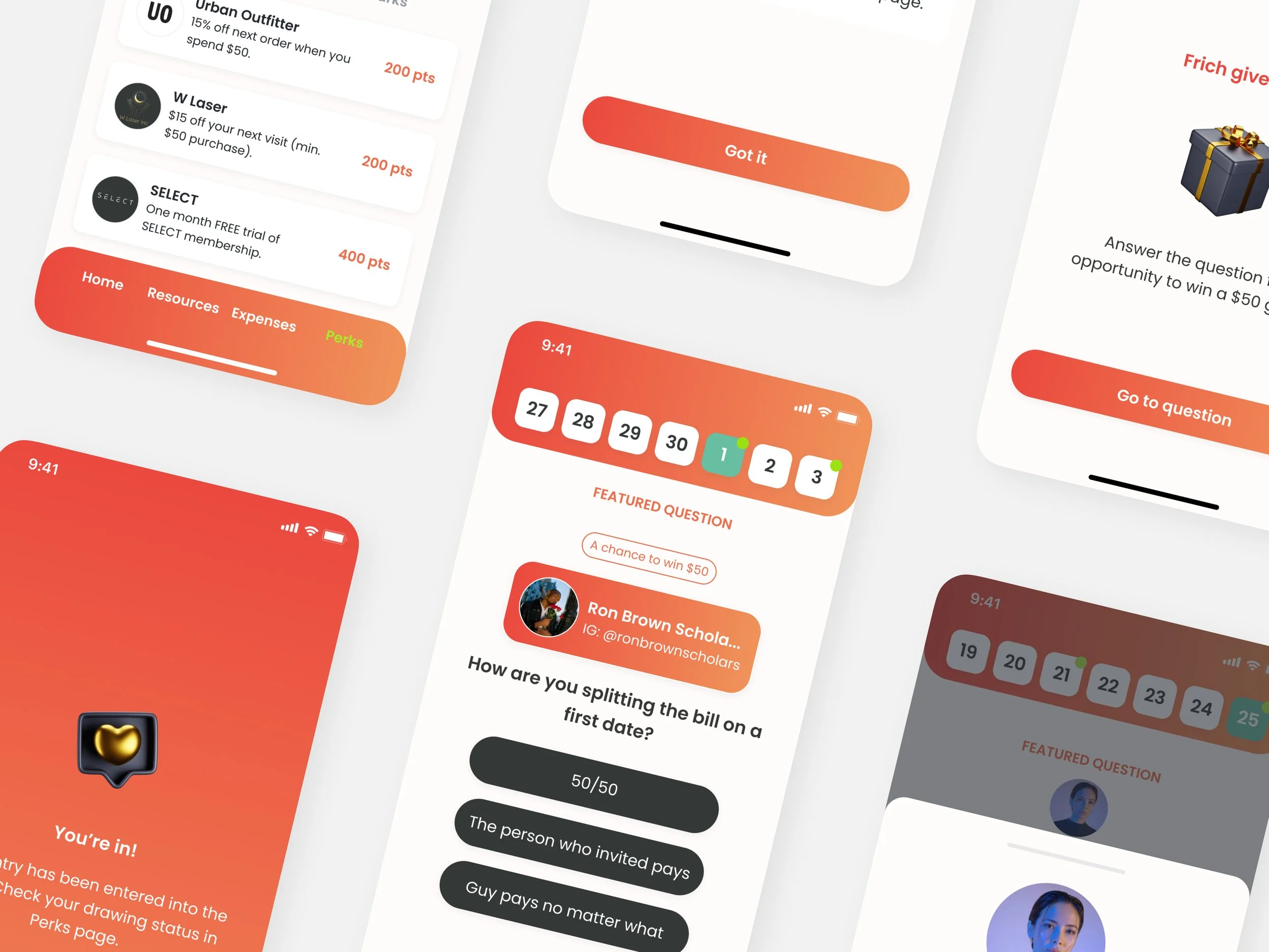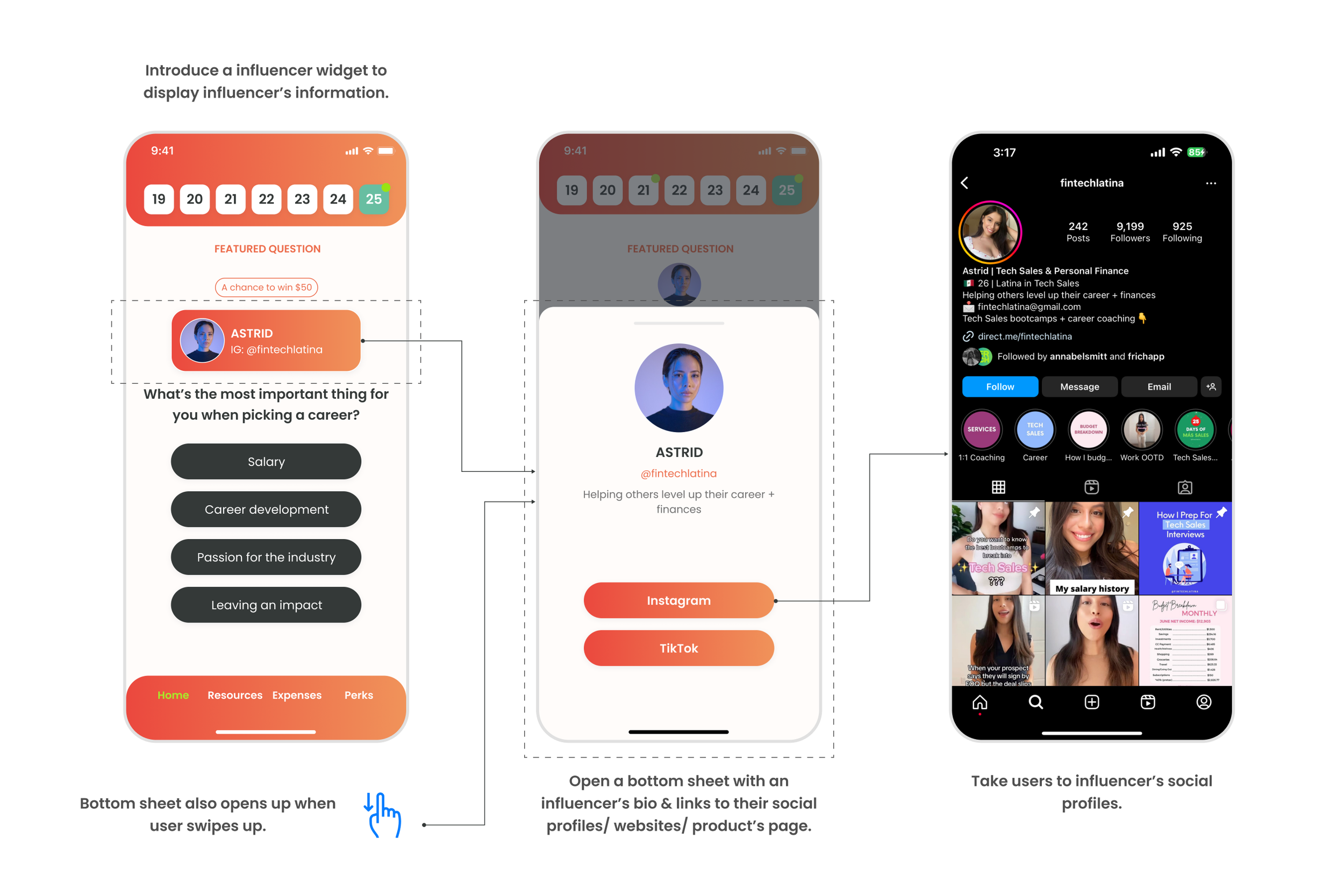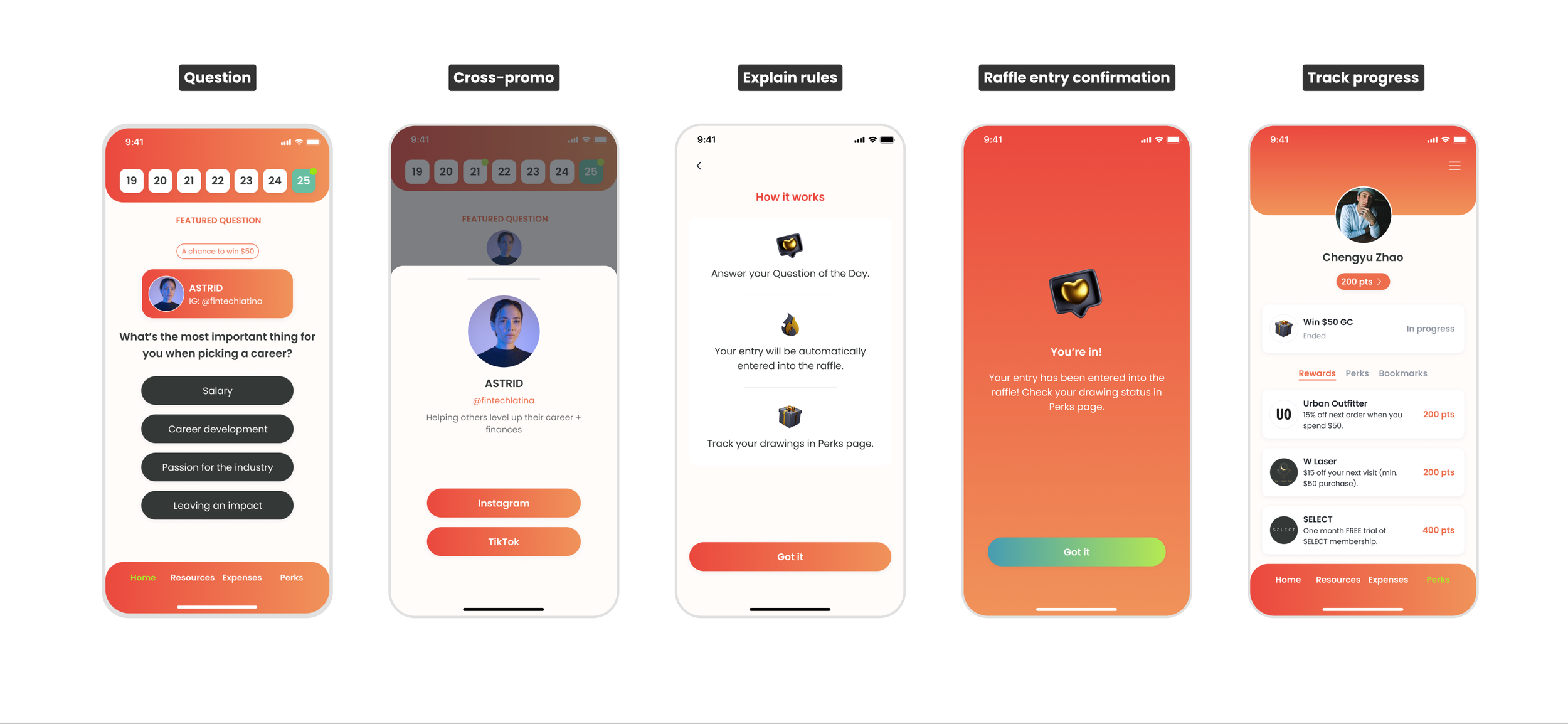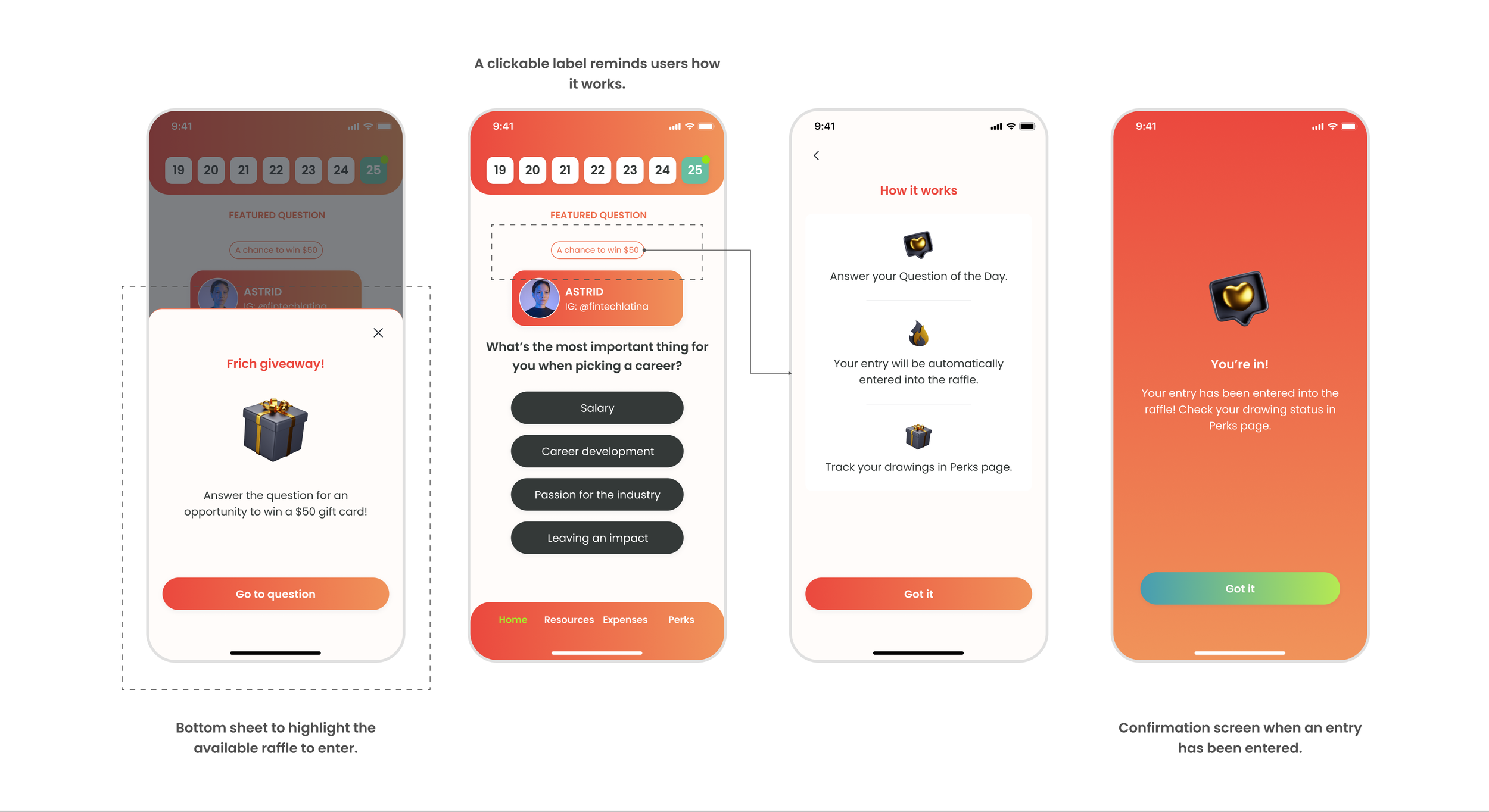 As a designer, I'm accustomed to presenting a product concept visually. So I crafted a conceptual mockup illustrating how we can potentially provide a way for Frich to collaborate with influencers and reach their audience. The concept was to support an in-app raffle, in influencer’s name, to win a $50 gift card.