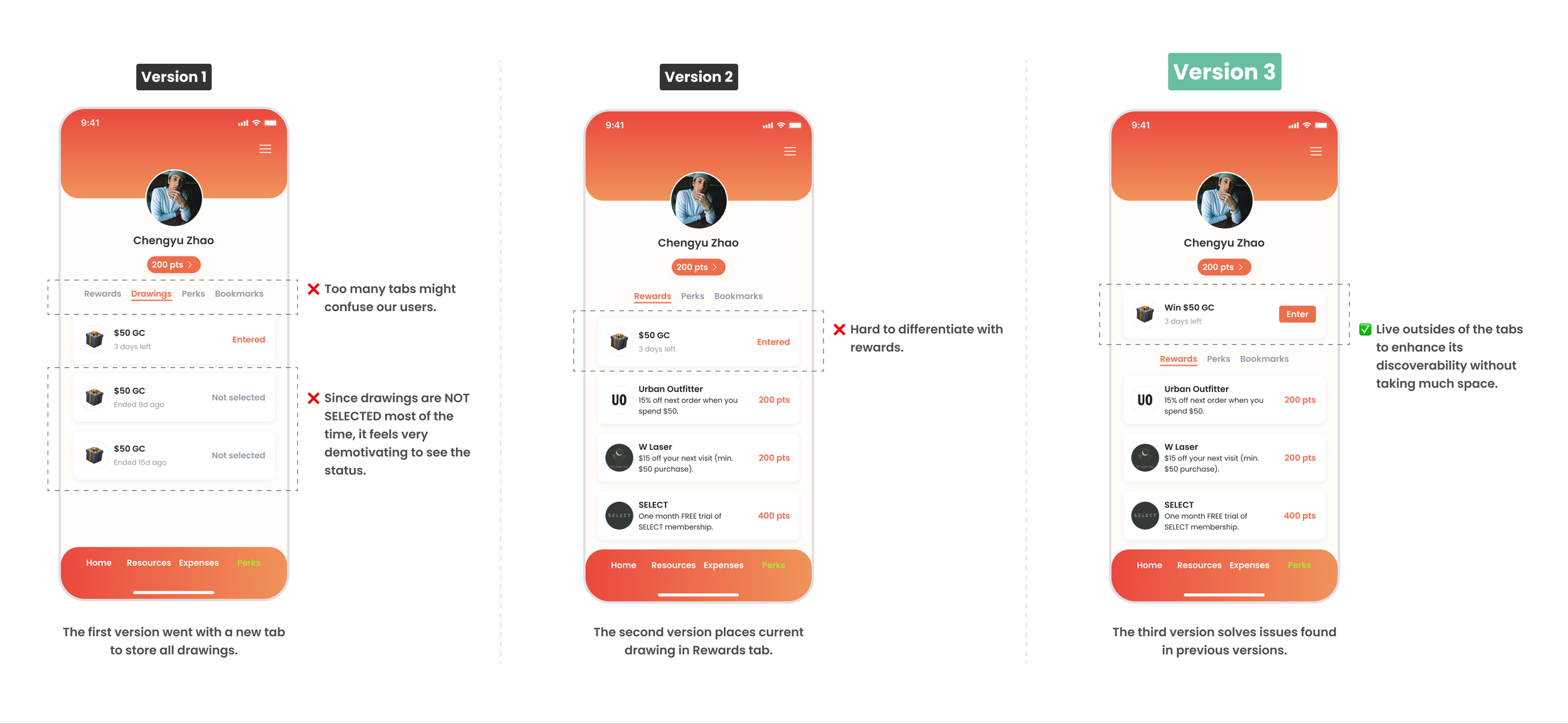 During the design process, I encountered many issues with the placement of a raffle entry. The progress should be easily discoverable and requires minimum development efforts as possible. I ended up adding a drawing progress card to the perks page (refer to version 3 in the graph below).