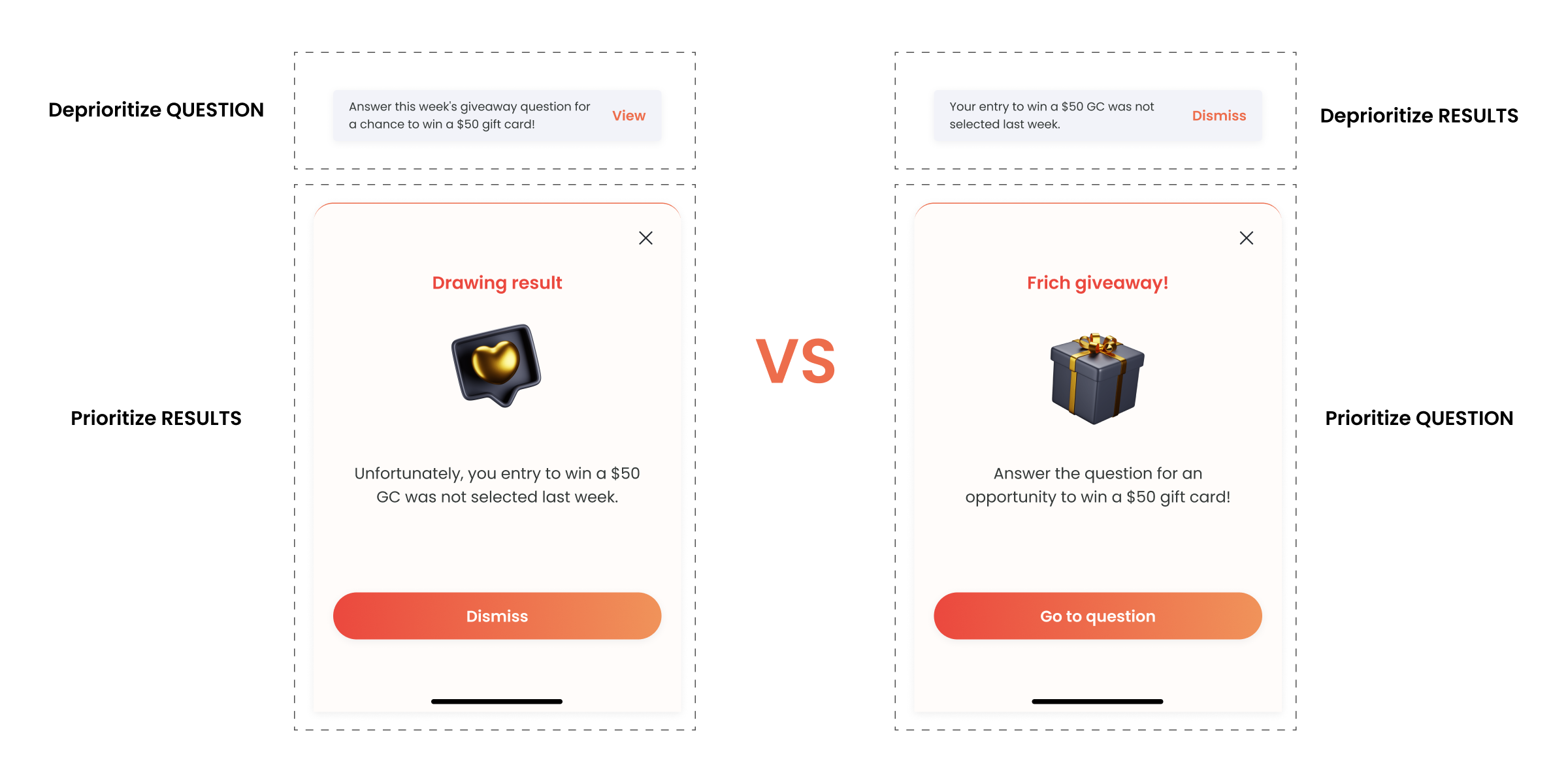 We decided to emphasize on announcing the new available question in bottom sheet and quietly inform users on the results, to diminish the feeling of loss.