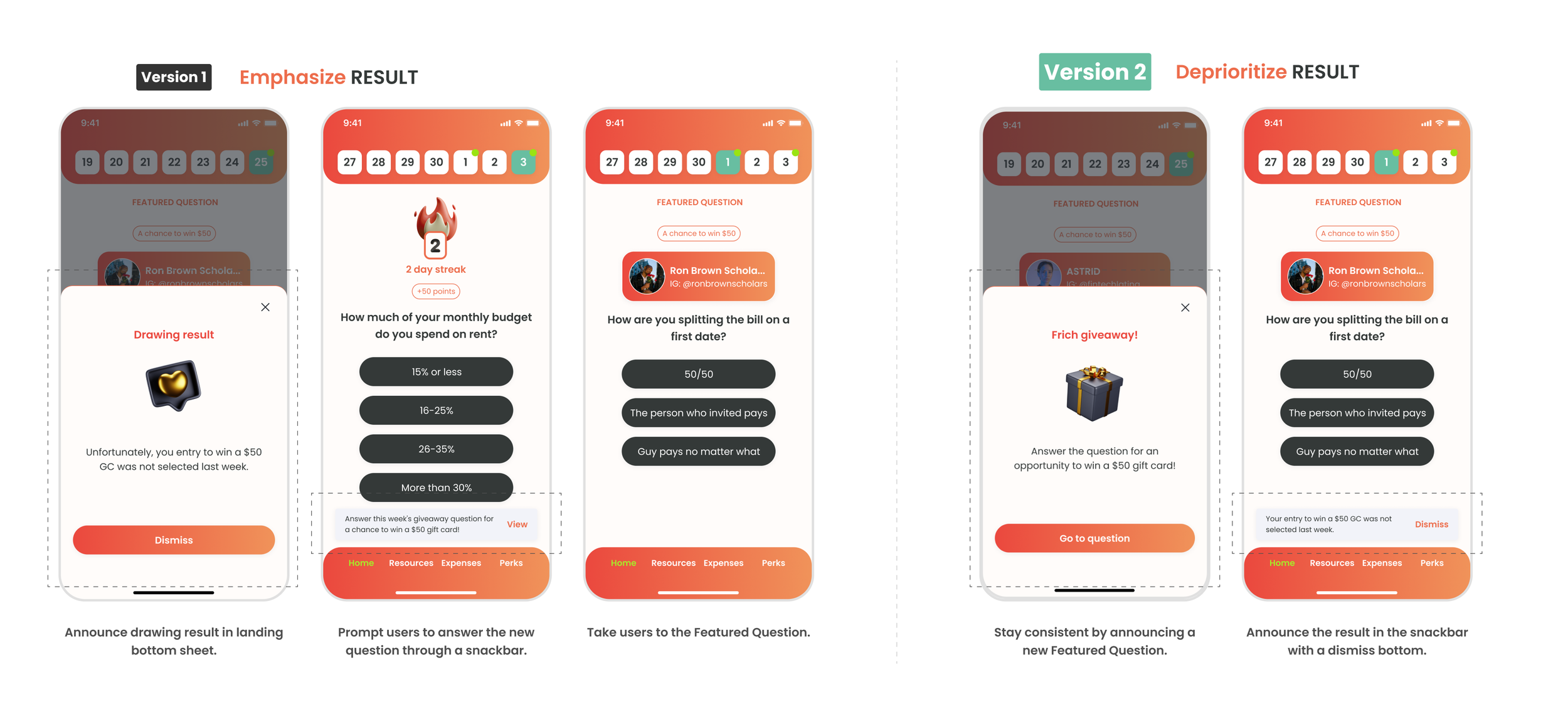 In the initial version, we tried to announce the drawing result in the bottom sheet and use a snack bar to take users to the new featured question. However, during our initial feedback from design review, the major concern was that the design emphasizes too much on user’s failure, which potentially demotivate them to engage. Therefore,