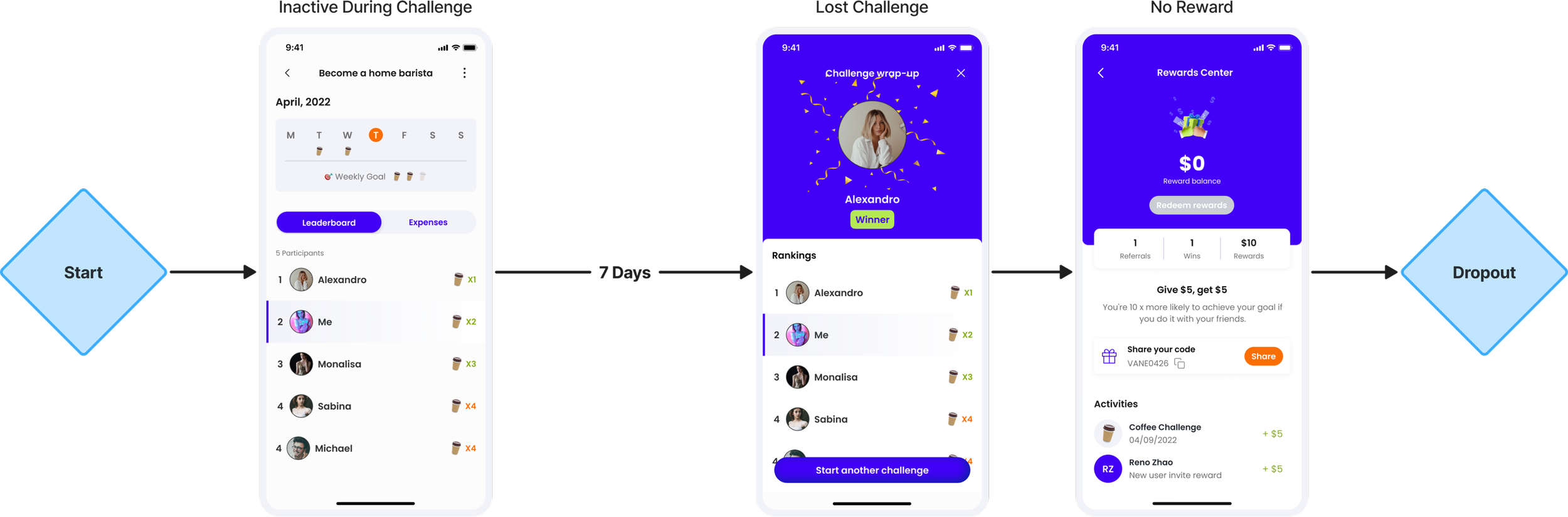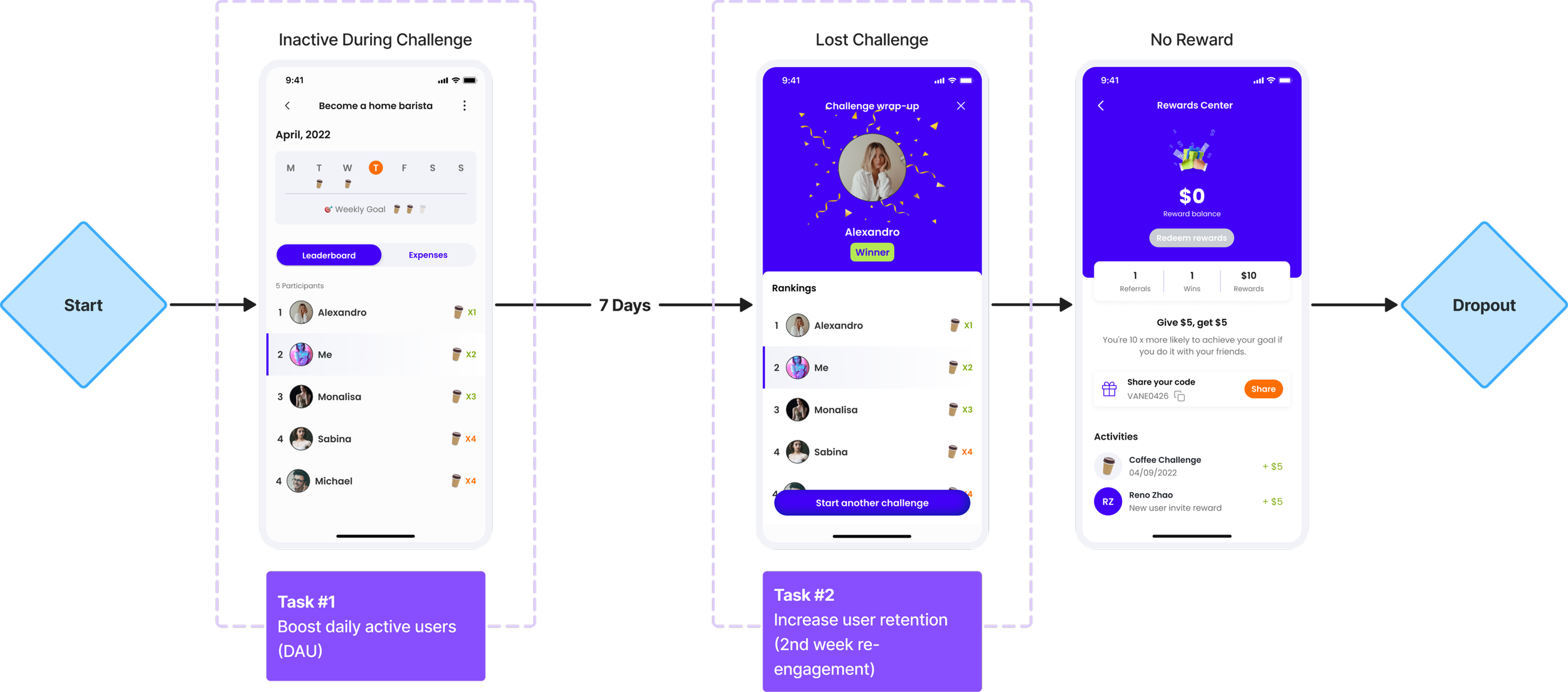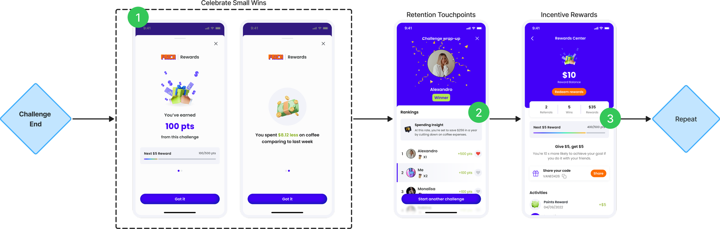 To shift the focus from pure competition to personal financial growth, we introduced key emotional touchpoints throughout the challenge journey: