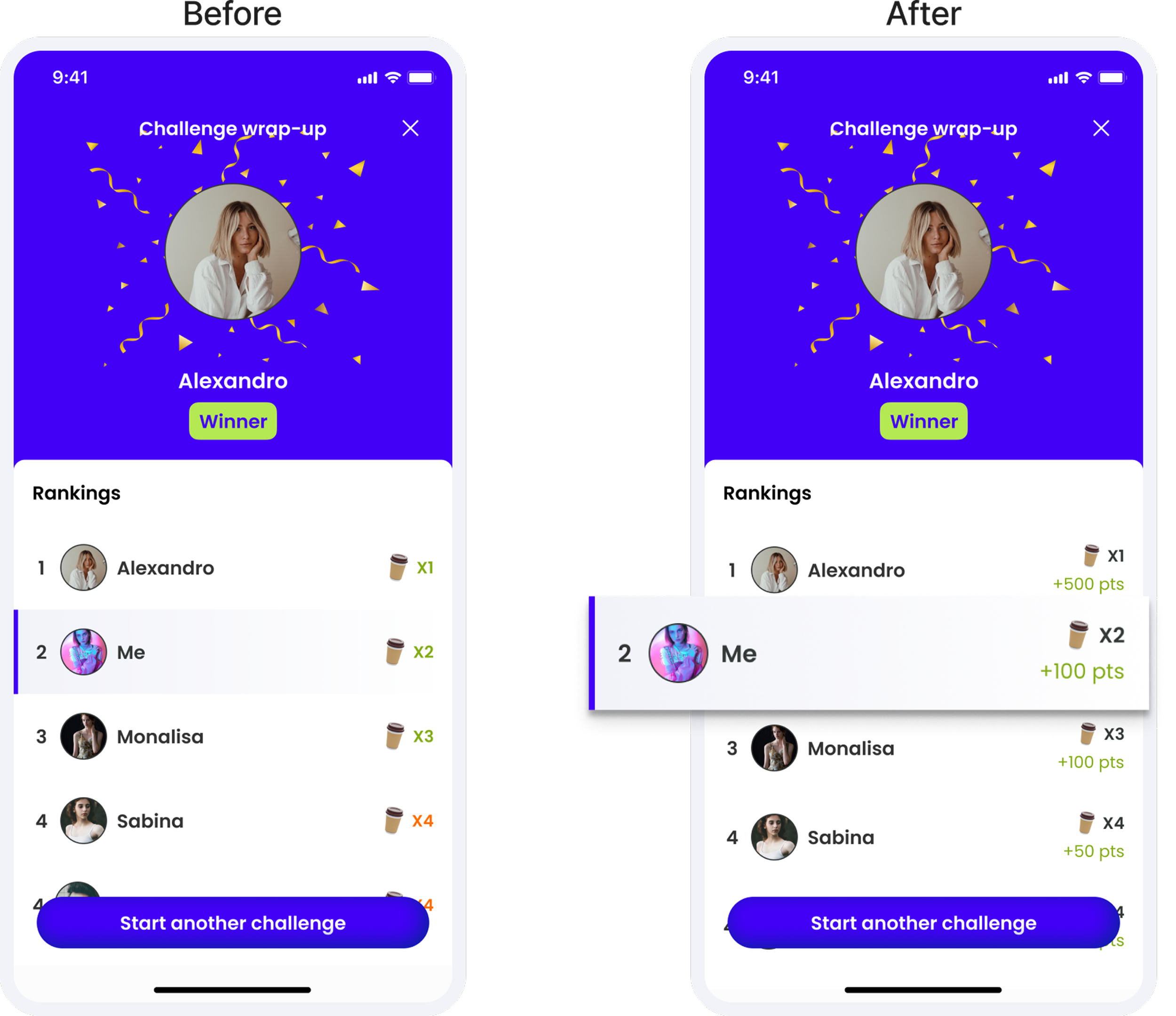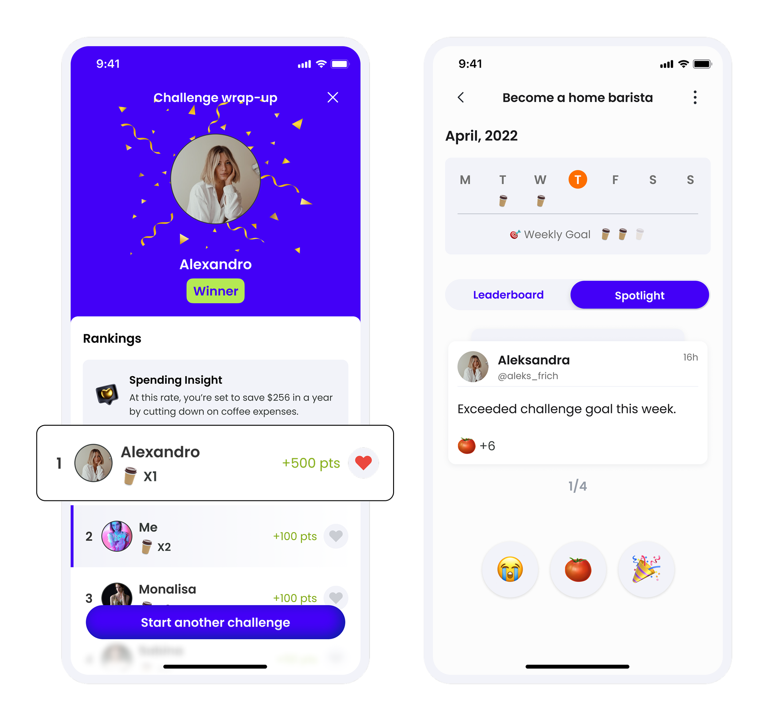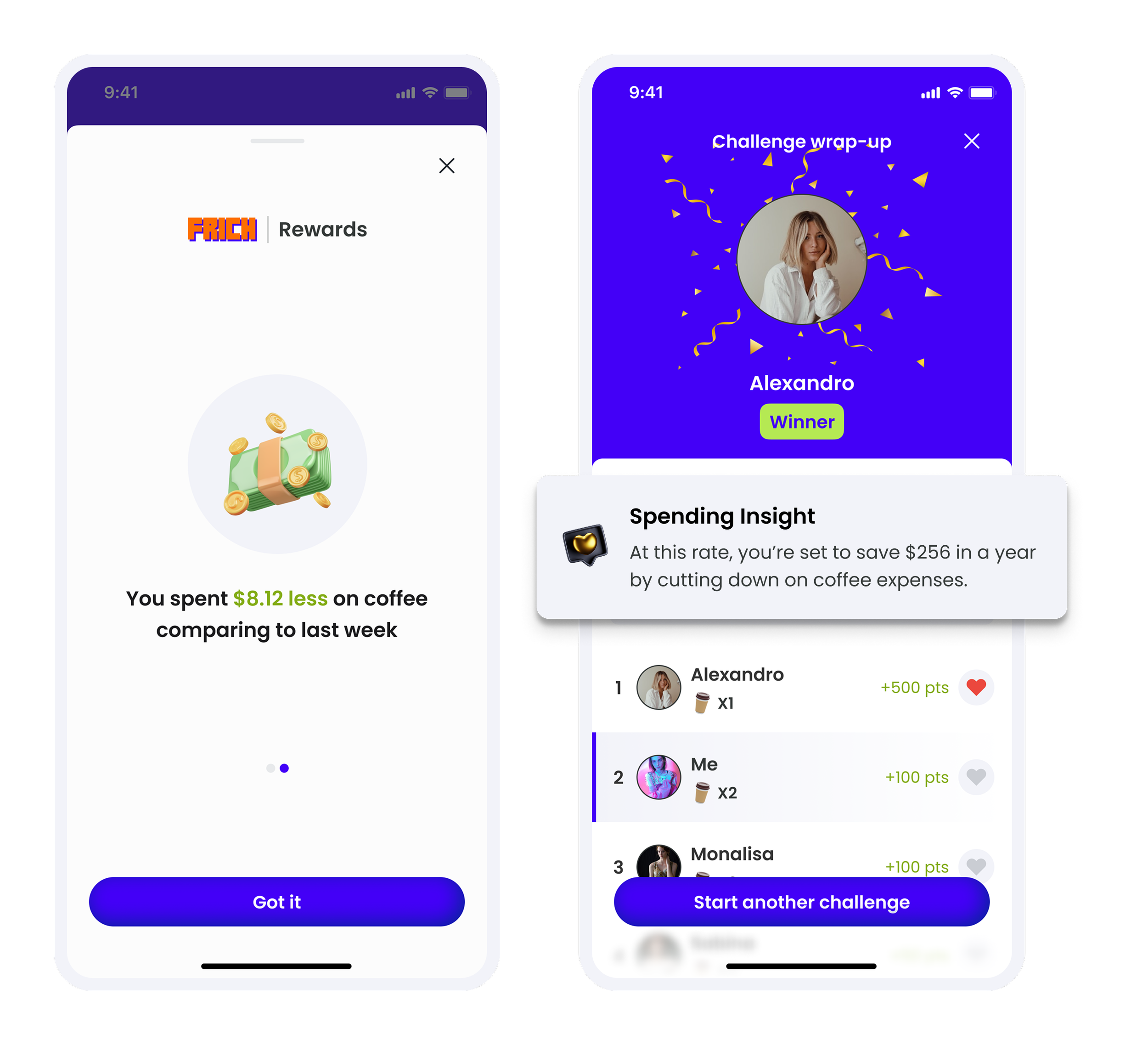 To shift the focus from pure competition to personal financial growth, we introduced key emotional touchpoints throughout the challenge journey: