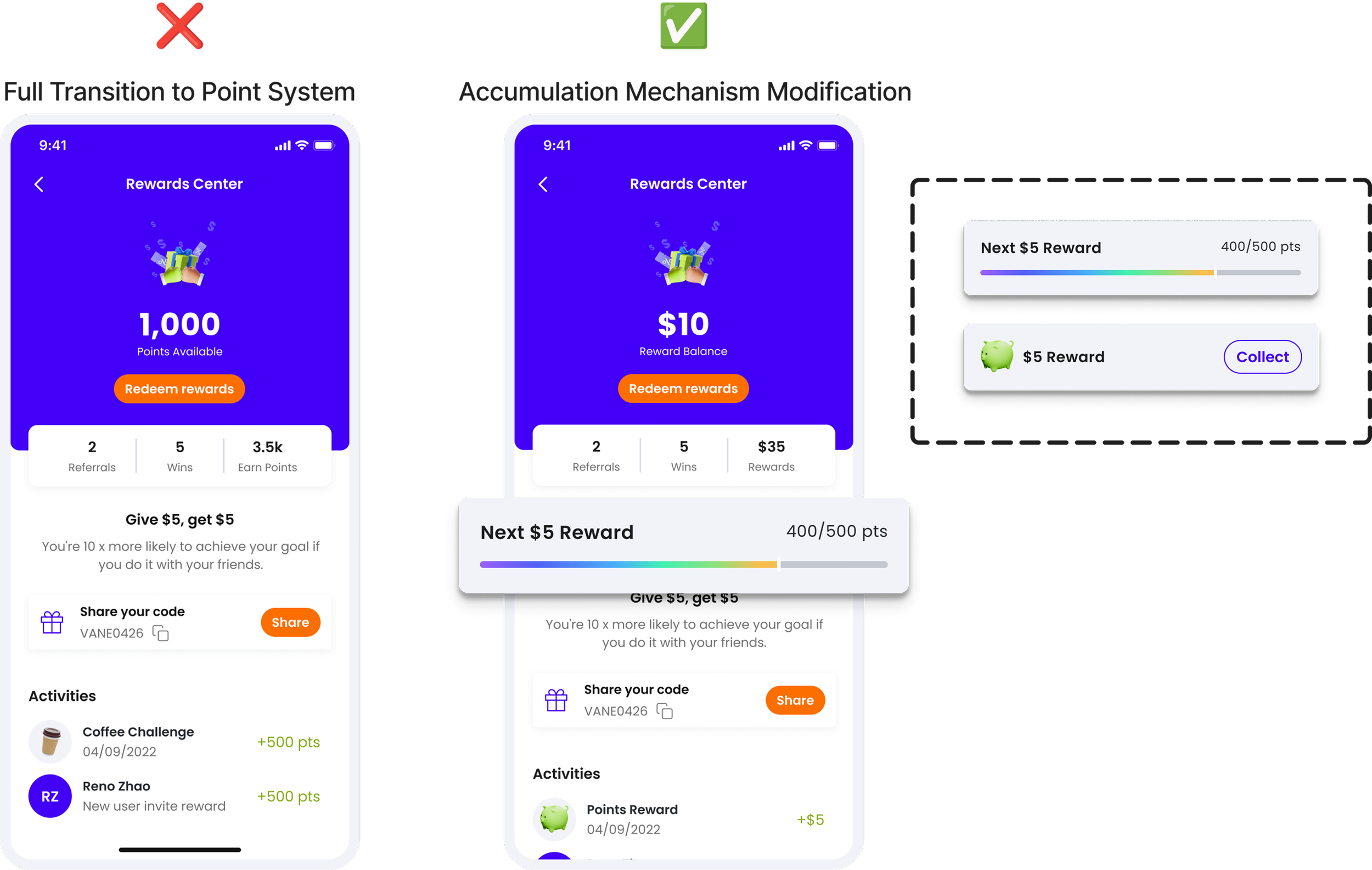 In our usability testing of the first version of the design, we discovered that existing users struggled to adapt to the complete overhaul of the reward system. This resulted in a learning curve that hindered users' ability to fully engage with the new system and impacted overall usability, preventing us from accurately measuring the true feasibility of the changes.